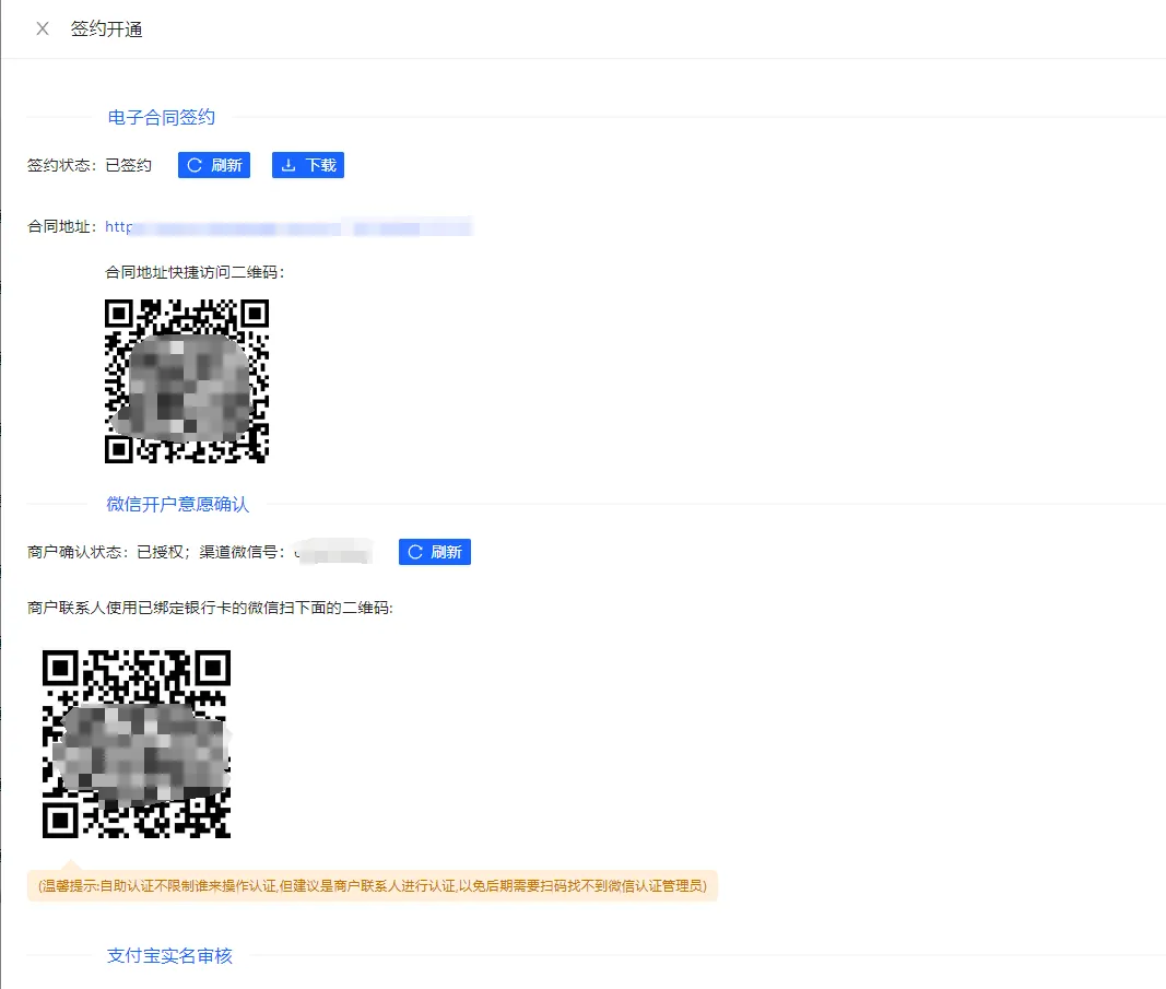 打开<签约开通>页面此时需入网用户法人主体手机扫码(电子协议签约/微信/支付宝实名认证)过程,完成此步骤后方可进行支付