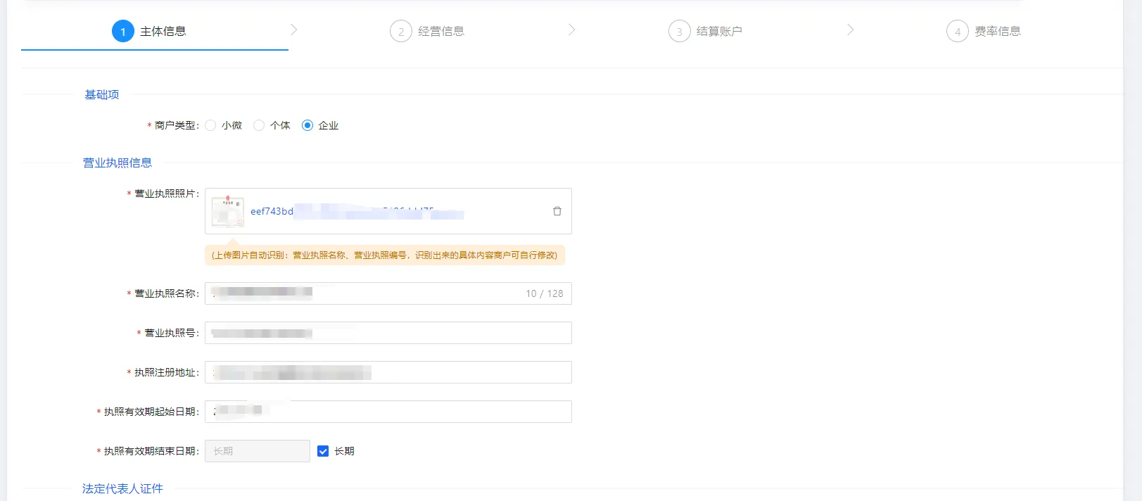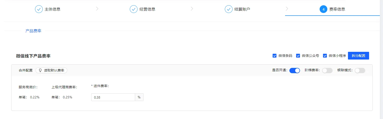 按需填写商户入驻费率信息(此为运营端示例,代理/商户请自行尝试,费率展示效果不同),单笔及银联阶梯说明不再赘述