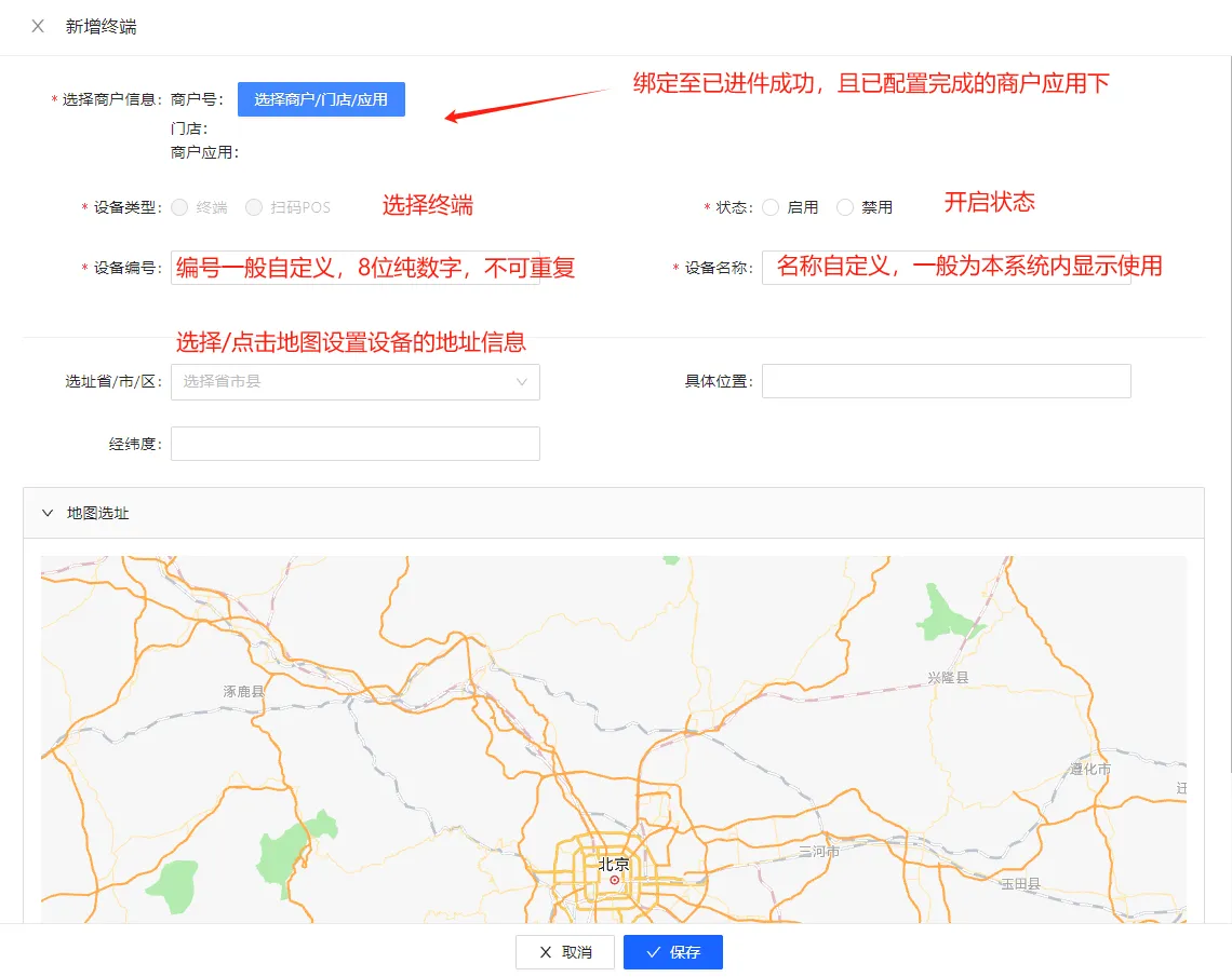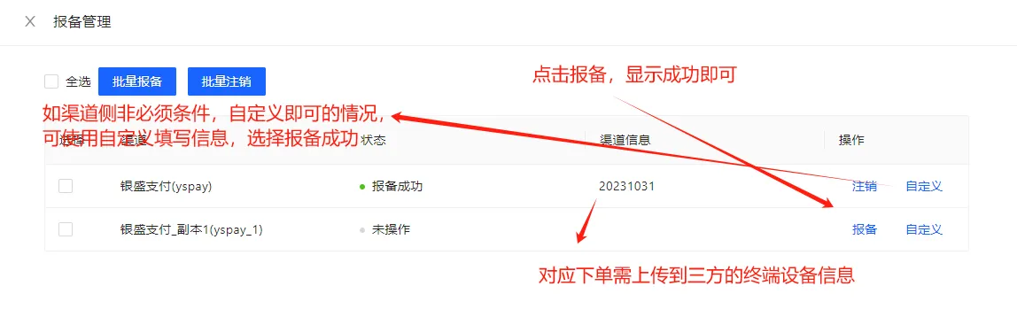 ○ 使用场景说明,如渠道侧要求支付必须含有终端报备信息,则此流程必须操作,以用于支付时上送渠道报备成功后的设备信息