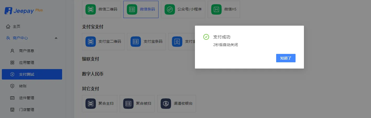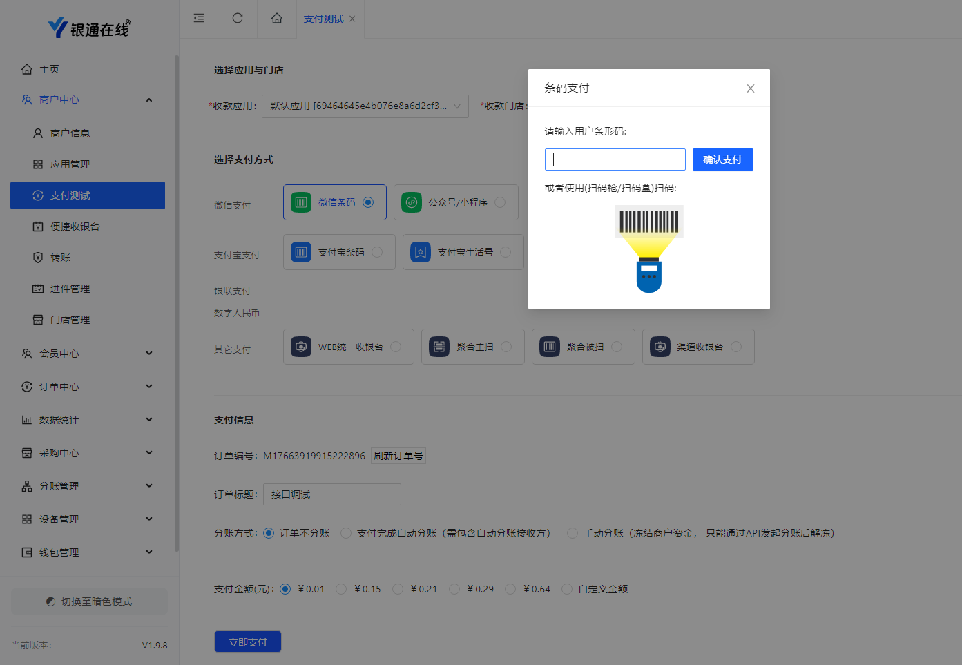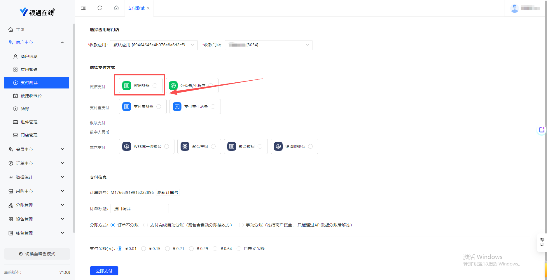 ● 登录商户后台-商户中心-支付测试